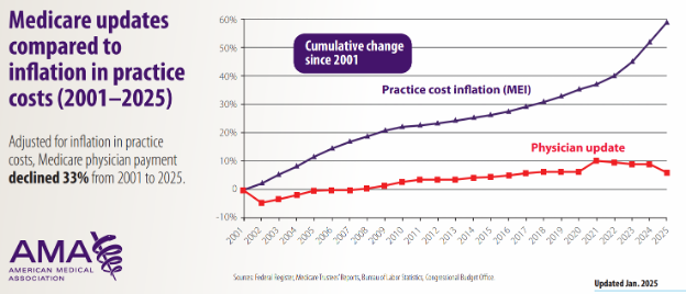 Policy organizations increasingly agree that the conversion factor needs more significant and sustained updates to ensure a healthy Medicare program. As the AMA recently stated in comments to Congress, “In their June 2025 Report to Congress, the Medicare Payment Advisory Commission (MedPAC) expressed concerns about the growing gap between physicians’ input costs and Medicare payment, warning: “[t]his larger gap could create incentives for clinicians to reduce the number of Medicare beneficiaries they treat, stop participating in Medicare entirely, or vertically consolidate with hospitals, which could increase spending for beneficiaries and the Medicare program.”